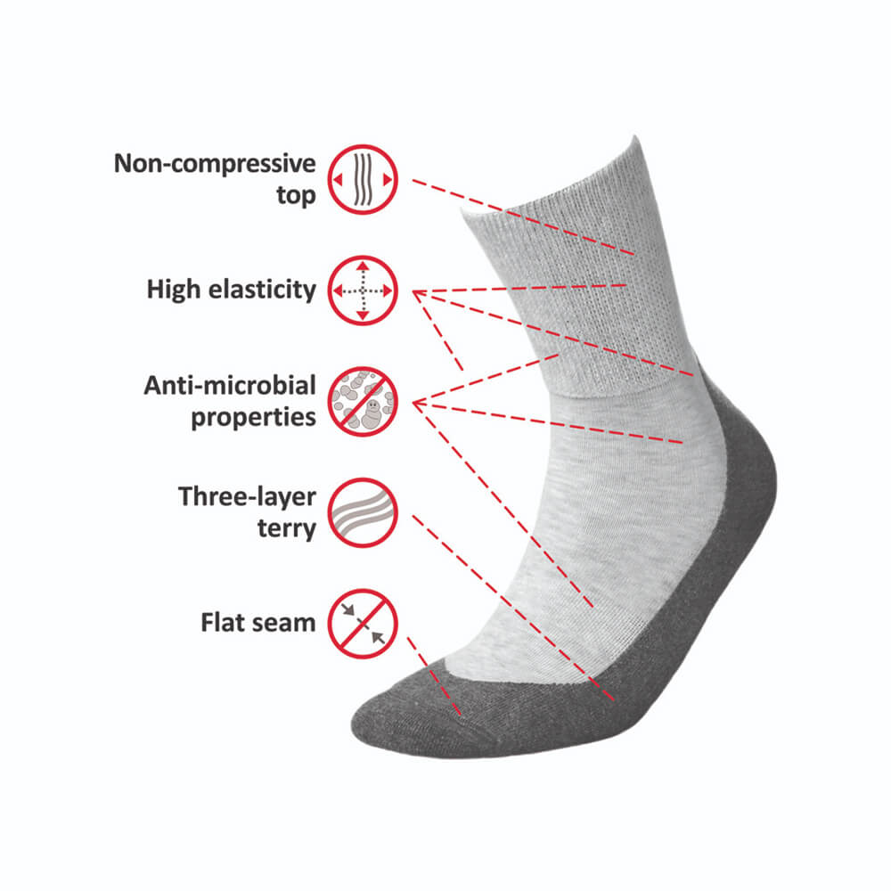 With a non‑compressive design, soft flat seams and a breathable three‑layer Terry construction, they are made to minimise friction, support comfort on swollen legs and help keep feet dry and protected during daily activity.